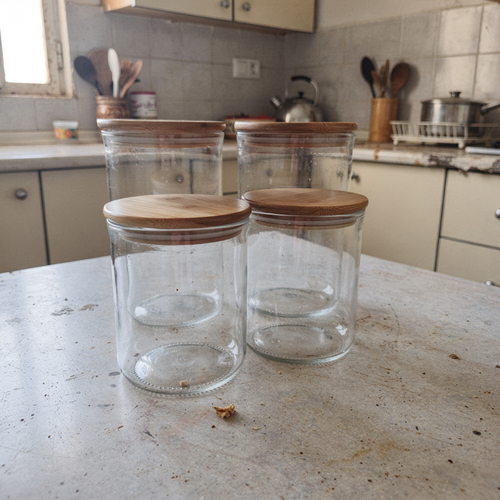 ثلاث علب زجاج بغطاء خشب طبيعي